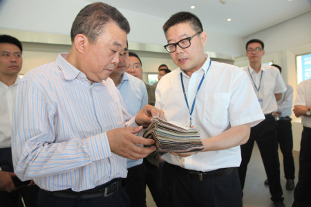 周厅长一行先后参观了集团形象展厅和氨纶公司生产车间。在参观过程中,林总裁向周厅长一行全面汇报了集团生产和经营情况。林总裁表示,今年以来,华峰克服了外部经济波动所带来的不利影响,继续保持了务实稳健的发展态势。1-3季度营业收入、利税、出口都实现了同比增长,其中出口额更是同比增长69%。林总裁指出,1-3季度的数据充分体现了华峰国际市场的开拓成效和内涵式发展的效益,也让华峰对自身的经济走势把握、转型升级举措和市场开拓方式更具信心。同时,林总裁还对省市商务厅系统领导在华峰电子商务等业务开展中给予的支持表示感谢,并希望今后能在企业转型发展和走出去方面给予更多的指导和帮助。