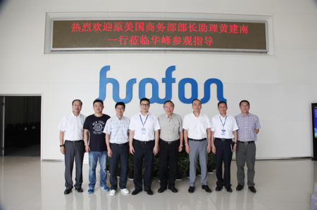 8月27日,原美国商务部部长助理黄建南一行在温州市工商联副主席徐欣隆,瑞安市委常委、统战部部长陈世尧的陪同下莅临华峰考察。