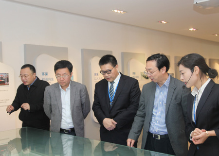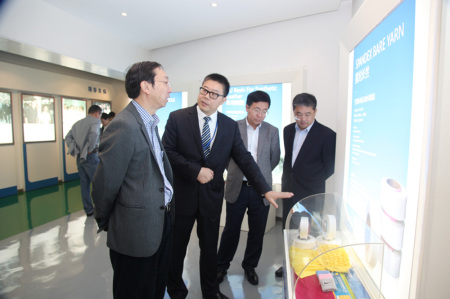 调研组一行在集团总裁林建一、副总经理翁奕峰的陪同下,先后参观了集团形象展厅和氨纶公司生产车间。林总裁结合“十三五”战略详细介绍了华峰的产业布局和发展规划,他说,华峰始终坚持“做强主业、适度多元、产融结合”的发展战略,积极响应政府“温商回归”的号召,通过发挥华峰的优势资源,大力实施“五大回归”项目建设,全力助推温州赶超发展。