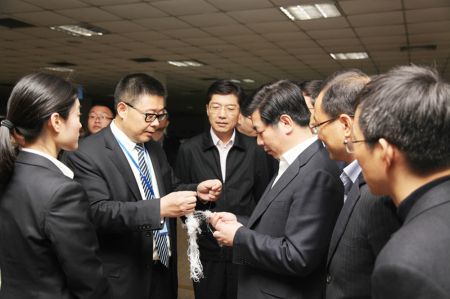 廖部长一行在集团总裁林建一、新材料/合成树脂公司董事长尤金焕的陪同下先后参观了集团形象展厅和氨纶公司生产车间。林总裁首先就华峰十大系列产品作了详细介绍,廖部长听后称赞道,华峰产品广泛的应用领域,得益于企业对推进科技创新和质量为上的不断追求。随后,他还兴致勃勃地询问起华峰的产业布局、产品开发和市场营销等情况,林总裁结合“十三五”战略一一作了汇报,他说,华峰在坚持“做强主业、适度多元、产融结合”发展战略的基础上,积极响应政府“温商回归”的号召,通过发挥优势资源,大力实施“五大回归”项目建设,发挥转型升级的示范和引领作用,力争当好温商回归的“领头雁”。