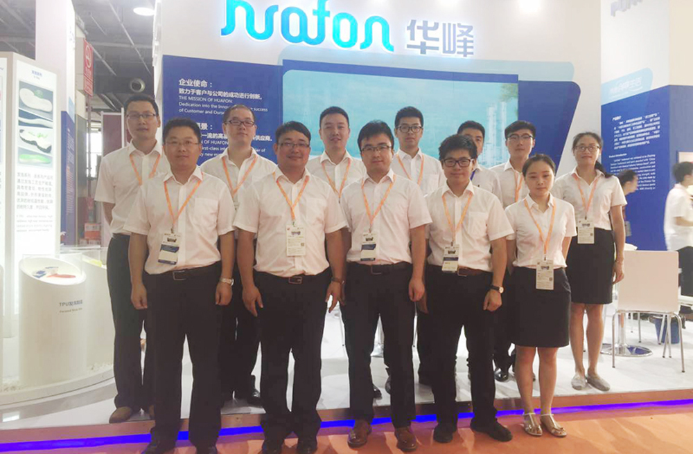 在为期三天的展会期间,华峰展厅门庭若市,展出的产品得到了海内外买家的热捧,不少客商慕名而来。展会现场,销售公司展出了适用于制作防护用劳保鞋的鞋底,制作舒适、防滑PU军鞋鞋底及其他多种制品的聚氨酯树脂新产品;TPU公司带来了适用于制作热熔胶膜、足球鞋大底、发泡鞋底、电线电缆、功能薄膜、密封件等聚氨酯制品的聚酯注塑系列、聚酯挤出系列、发泡系列等新产品。