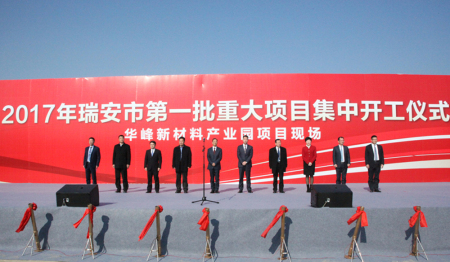 当天上午,作为“温商回归”重大招商引资项目——华峰新材料产业园项目,与其他16个瑞安市2017年第一批重大项目一起,举行了隆重的集中开工仪式。瑞安市委书记陈胜峰,市委副书记、代市长麻胜聪,市人大常委会主任叶世林,市政协主席白一帆等瑞安市四套班子领导悉数出席,仪式由副市长曾瑞华主持,市委副书记、代市长麻胜聪致辞,市委书记陈胜峰宣布了开工令!