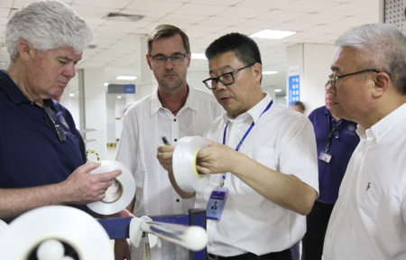 随后,双方步行前往氨纶生产车间,在经过厂区的一条河时,林总裁向来宾郑重介绍道,“这是用来检测工厂水质状况的”,菲利普?康奈利赞赏此举是最好的环保宣传。来到氨纶车间,当走过一排排整齐排列的机器时,菲利普?康奈利饶有兴致地询问这些机器的来历,当得知起先是进口,现在都已实现国产化时,他非常惊讶。