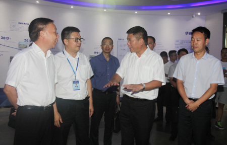 葛主任一行在集团总裁林建一,集团副总裁、新材料公司董事长尤金焕的陪同下实地参观集团形象展厅,详细了解企业生产运营情况。林总裁介绍说,近年来,华峰集团以“三大战略”为指引,以“四大创新”为支撑,以供给侧改革为重心,进一步加强顶层设计,加快内部变革,提高整体效能,保持了务实稳健的发展态势,积累了企业发展的新优势。今年1-6月份,全集团实现营业收入同比增长62.56%。其中,温州总部实现营业收入同比增长49.18%。产能、销量以及市场占有率总体保持稳步增长,市场地位和发展潜力得到进一步的巩固。
