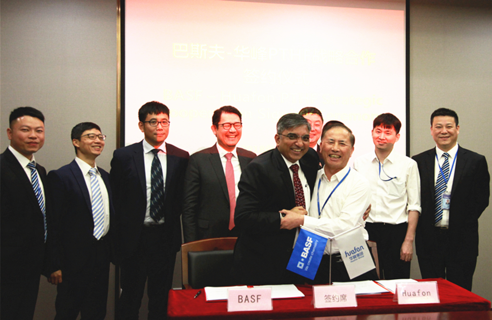 为实现互利共赢、共同成长,4月24日,巴斯夫与华峰集团PTHF战略合作签约仪式在华峰总部大楼隆重举行。华峰集团高级副总裁尤金焕、副总裁尤飞煌,氨纶公司董事长杨从登,新材料公司副董事长夏岩林等领导和来访贵宾巴斯夫亚太高级副总裁Mohan先生等人共同参与并见证了签约仪式。
