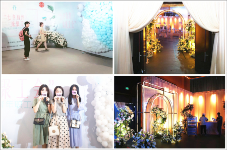当天晚上7点,活动现场已经热闹非凡。五色的气球、绚丽的灯光、精美的饰件将现场布置得温馨高雅,宛若礼堂一般。“主场作战”的华峰青年们当然不会错过在自家门口的好机会,在脱单墙前,认真寻找着适合自己的心仪对象。