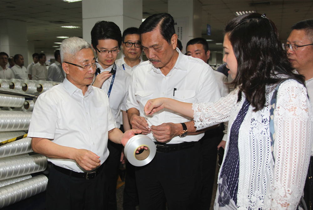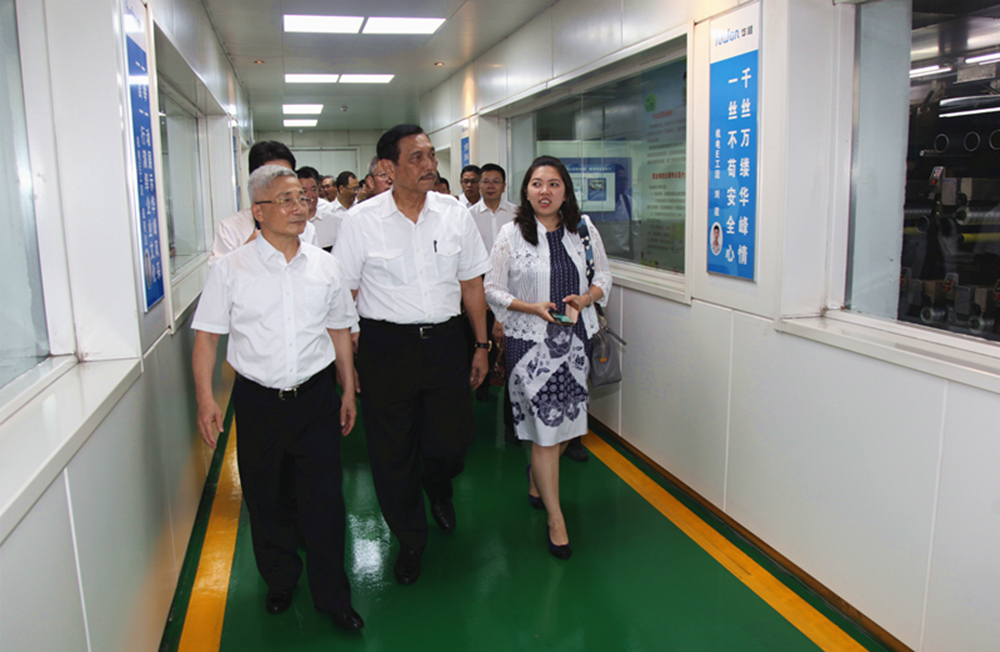 在整洁舒适的生产环境中边走边看,卢胡特不时颔首称赞。在氨纶包装车间,一排排整齐摆列的氨纶成品吸引了卢胡特的目光,他饶有兴致地询问起相关情况。尤小平回答道:“这是我们的氨纶长丝成品,叫‘千禧’,像我们身上穿的衣物、袜子,还有印尼沙滩上人们穿的泳衣泳裤等具有弹性的生活品,都有它的功劳,目前我们是全国第一、全球第二的氨纶生产企业,到2020年,目标就是成为全球最大。”