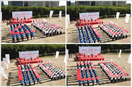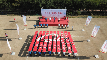 在主持人的指挥下,参赛者们举起印有“华峰氨纶20周年,携手同行二十年,开创未来大发展”的祝福语牌,有序地切换着不同的队形,依次举牌摆出“ZG”、“70”、“HF”和“20”四个字母图案,形象地表达了“庆祝祖国成立70周年,华峰氨纶成立20周年”的美好寓意。