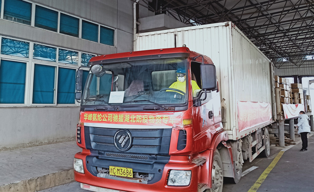 1月31日下午2:30,华峰氨纶工业园区第一批无偿捐赠的10吨装满医护用品生产原料的物资专车启程开往湖北。