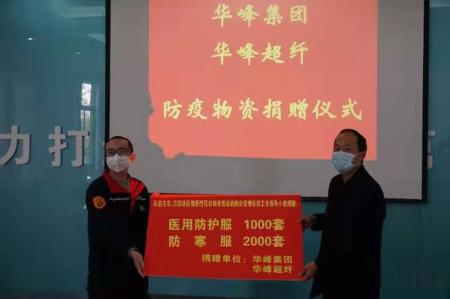 2月4日下午3时许,华峰集团、华峰超纤向江苏启东市、吕四港镇捐赠医用防护服1000件、防寒服2000件、口罩6.5万个、消毒剂600吨等总价值110万元防疫物资。