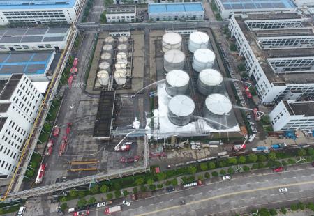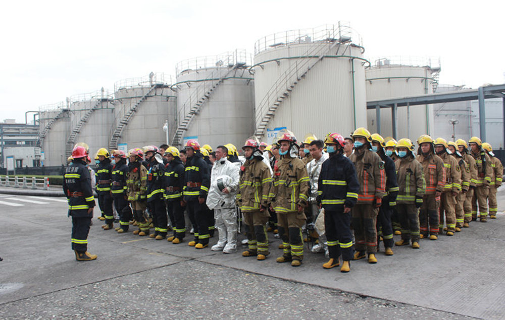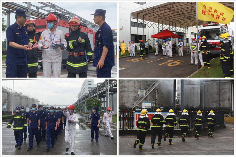为响应浙江省应急管理厅《关于开展2020年全国“安全生产月”和“安全生产万里行”活动的通知》的号召,增强安全防范意识和提高应急处置能力,提高快速反应能力、应急救援能力以及协同作战能力,6月5日10时整,温州市消防救援支队联合瑞安消防救援大队在浙江华峰新材料有限公司溶剂罐区上演了一场极具实战性的应急演练。温州市消防救援支队支队长罗军、副支队长李宿龙,瑞安消防救援大队政委沈国松、大队长杨亦坤,新材料公司副总经理王碧、总经理助理徐旭、集团HSE部副经理赵金泉亲临现场实战部署,同时参与的还有HSE部人员、仓储中心人员、各应急救援队伍及各队消防指战员,合计150余人,共出动20余辆消防车,达到了领导带头参与、演练覆盖面广、效果逼真有效的目的。