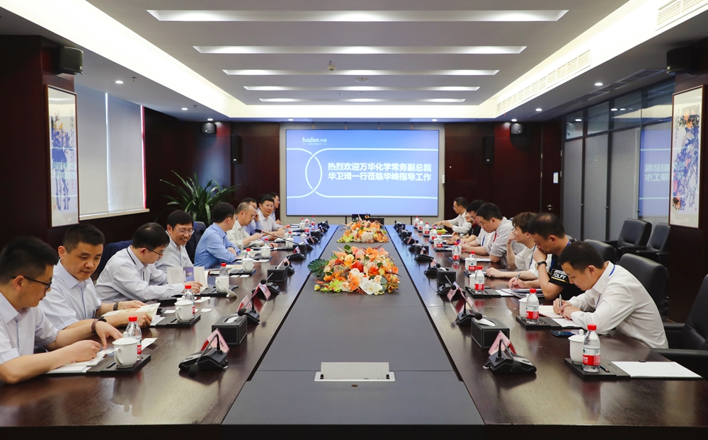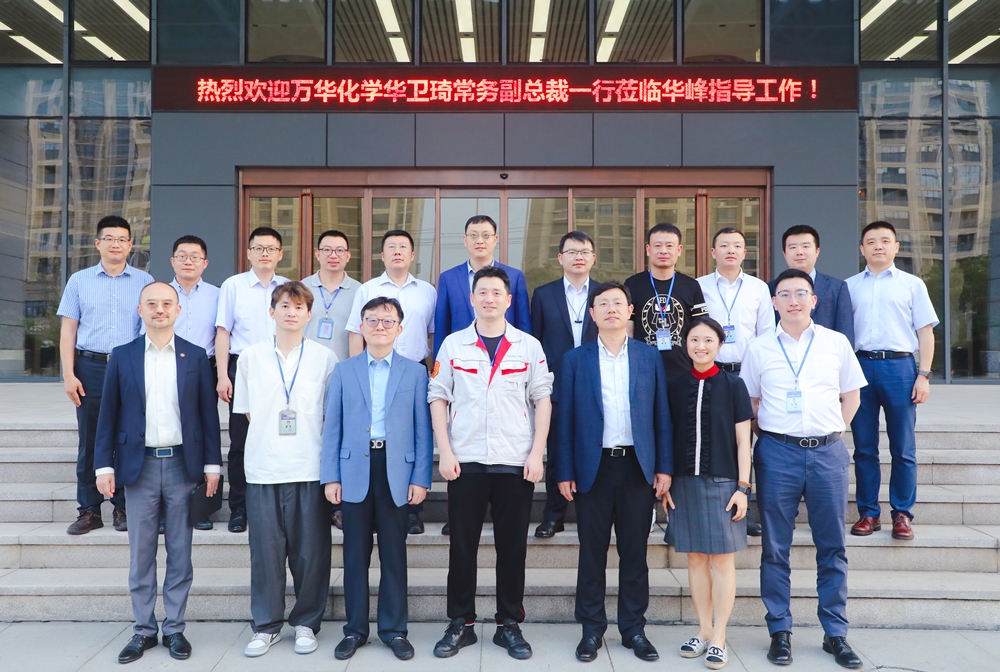 日前,万华化学常务副总裁华卫琦一行莅临华峰考察交流。集团董事长尤飞宇,副总裁尤飞锋、尤飞煌、尤若楠等领导热情接待了来宾一行。