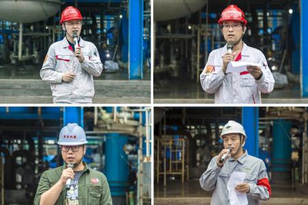 随后,承建单位十三化建和中石化建的项目领导先后作了表态发言,表示将一如既往地积极响应号召,坚决服从安排,加班加点,保质保量完成己二腈项目(二期)的收官任务。