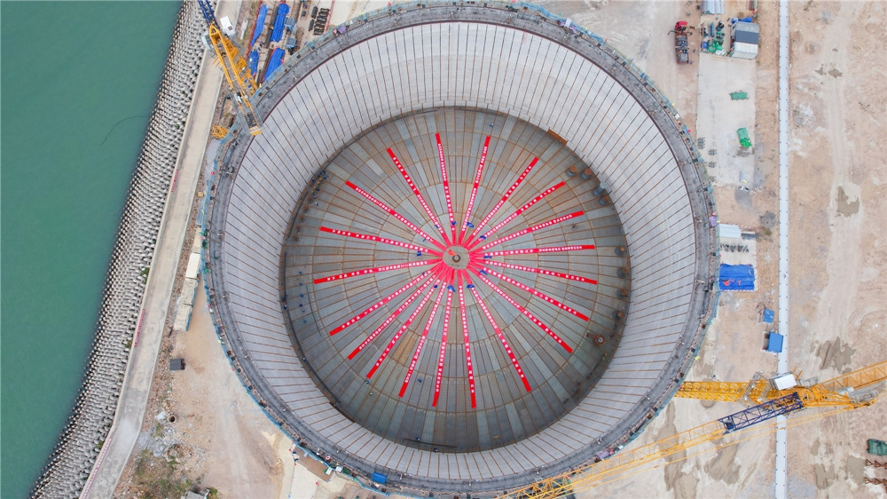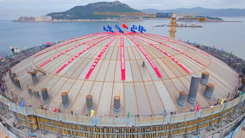 升顶的罐区犹如一颗璀璨的明珠,镶嵌在我国东海黄金海岸线上。据了解,气升顶作为大型LNG储罐安装施工的关键工序,具有工艺复杂、技术含量高、操作和控制难度大等特点。将穹顶结构这一面积与足球场相当的“巨无霸”从地面用气压顶到高空,相当于完成了一次“乾坤大挪移”。
