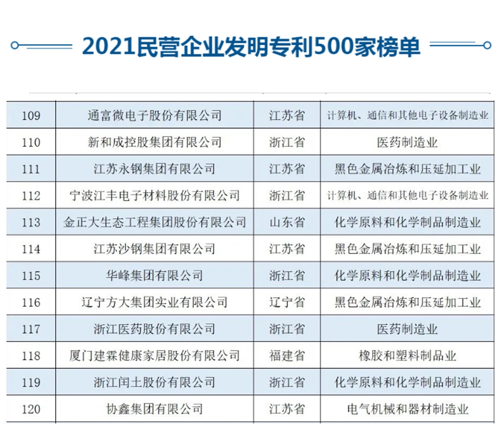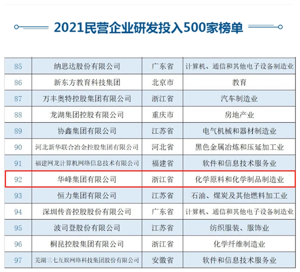 近日,全国工商联和广东省政府在广州联合主办2021粤港澳大湾区民营企业科技创新峰会暨民营企业科技成果对接会。会上,“2021民营企业研发投入500家”、“2021民营企业发明专利500家”榜单正式发布。华峰集团荣登2021民营企业研发投入第92位,2021民营企业发明专利第115位,榜单数据充分展示出了企业在科技创新、高质量发展方面的综合实力。