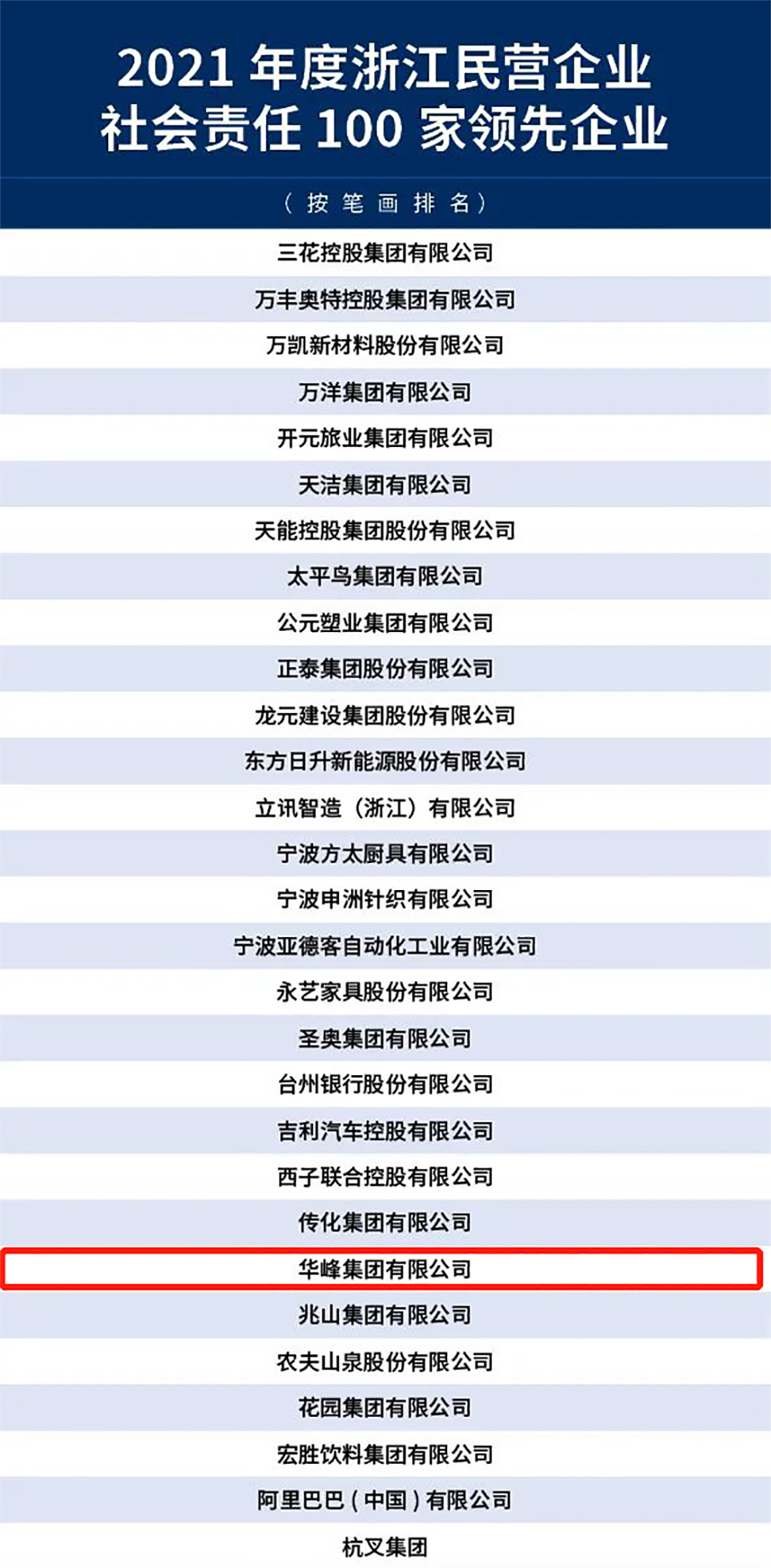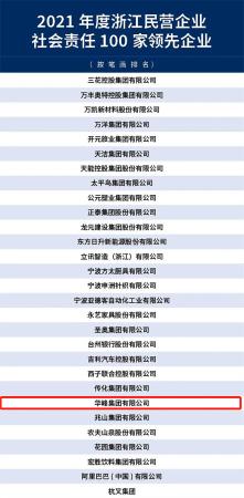 12月28日,浙江省工商联首次发布2021年度浙江民营企业社会责任100家领先企业,华峰集团凭借多年来在民企社会责任领域的先进做法和突出贡献率入选榜单。
