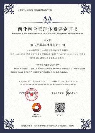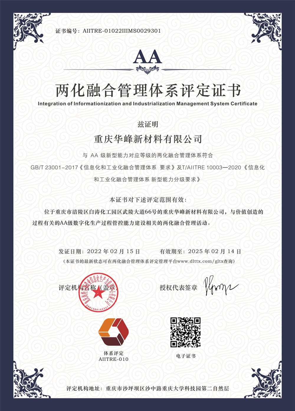 近日,工信部公示了2022年度首批获得“两化融合管理体系”评定的企业名单。经过涪陵区、重庆市两级政府的推荐,以及专业协会的评定和工信部专家组的评审,重庆华峰新材料有限公司成功通过“两化融合管理体系”评定。
