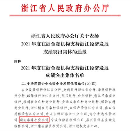 近日,浙江省金融工作座谈会在省人民大会堂隆重召开。会议表彰了2021年度在浙金融机构支持浙江经济发展成绩突出集体,瑞安华峰小贷公司获评“支持民营企业小微企业发展优秀单位”,成为全省小贷公司中仅两家获此殊荣的企业。