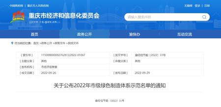 据悉,为贯彻落实国家《“十四五”工业绿色发展规划》,强化绿色制造标杆引领,本届评选名单经申报单位自评价、第三方评价机构评价、区县经济信息主管部门初审及推荐、专家论证、公示等一系列程序,最终确定了2022年度重庆市绿色制造体系名单。