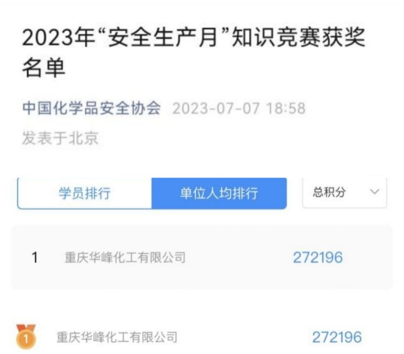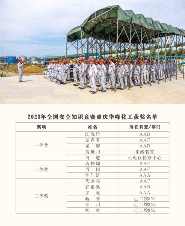 值得一提的是,本次全国竞赛于6月30日圆满收官,重庆华峰化工以272196的总积分高居榜首,并在主办方评选的17名个人一等奖、23名个人二等奖和62名个人三等奖中分别占据5个、3个和6个席位。