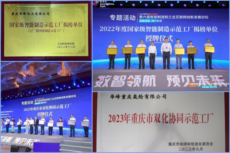论坛上隆重举行了“2022年度国家级智能制造示范工厂揭榜单位和优秀场景”授牌仪式,重庆华峰化工有限公司获评“国家级智能制造示范工厂揭榜单位”,全市仅6家企业获此殊荣。与此同时,同台登场的华峰重庆氨纶有限公司作为全市10家获评企业之一,荣获“2023年重庆市双化协同示范工厂”称号。