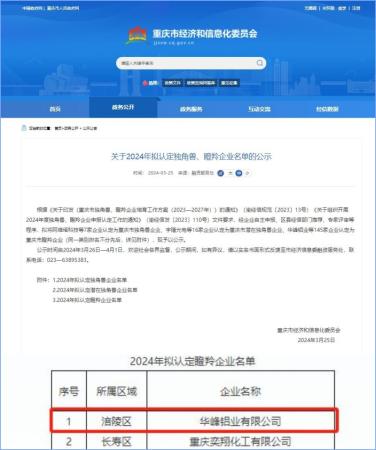 近日,从重庆市经济和信息化委员会传来喜讯,经申报、区县经信部门推荐、专家评审等程序,华峰铝业有限公司成功获评2024年重庆市“瞪羚企业”称号。