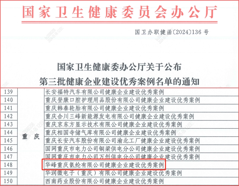 日前,国家卫生健康委办公厅公布第三批健康企业建设优秀案例名单,华峰重庆氨纶有限公司成功入选,是重庆市本次获评12家企业之一,也是涪陵区历年以来唯一上榜的企业。