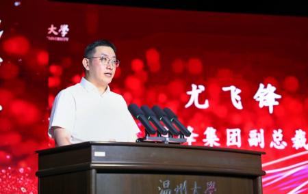 “感谢温大校领导及全体师生的精心组织与辛勤付出,让华峰品德奖成为一项具有广泛影响力和深远意义的公益品牌。”尤飞锋在典礼致辞中指出,温州向来是一座品德之城,从商行天下到善行天下,“义利并举”的道德观已经传承了千年。温大继承优良传统,赓续品德风范,涌现出了一大批德才兼备的教师、校友和品学兼优的学生,用凡人善举、质朴之美,书写了新时代的社会主义核心价值观。华峰集团非常荣幸能与温大一起,继续支持并鼓励更多师生注重品德修养,做文明道德风尚的传播者、践行者和引领者。