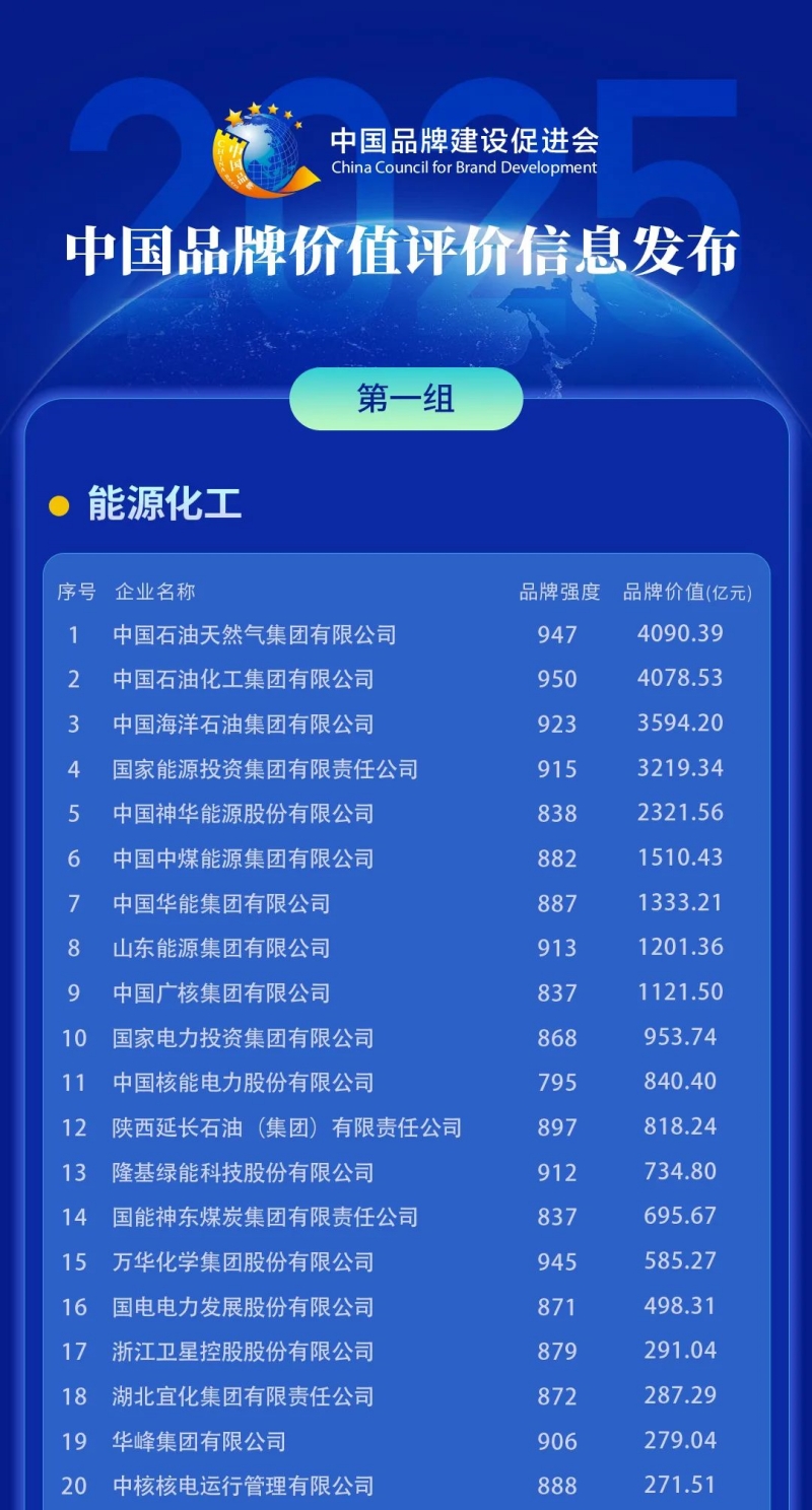 5月10日,由中国品牌建设促进会、中国资产评估协会主办,新华社品牌工作办公室、《中国品牌》杂志社等单位承办的“2025中国品牌价值评价信息”在浙江德清正式发布。榜单可见,华峰集团品牌价值跃升至 279.04 亿元,稳居国内能源化工组第19位。