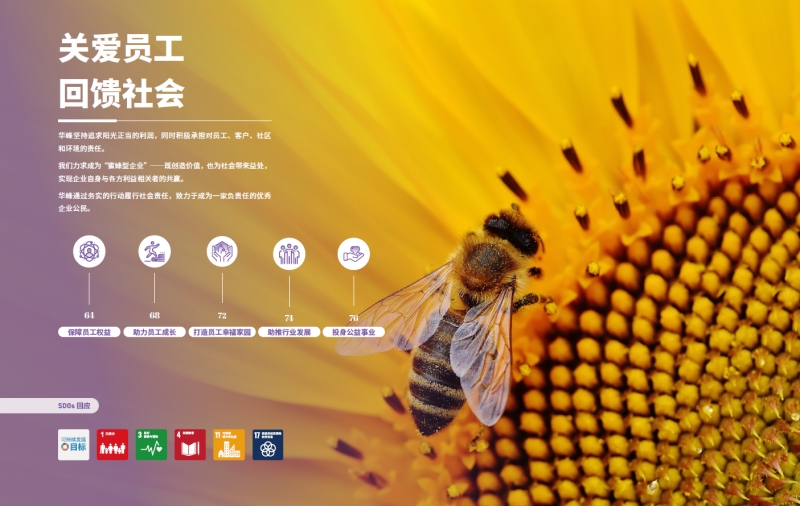 作为“蜜蜂型企业”,华峰集团追求阳光利润,同时积极履行对员工、客户、社区和环境的责任。集团严格遵守法律法规,保障员工权益,提供领先薪酬福利与科学晋升通道;建立成熟安全管理体系,有效预防安全事故;响应共同富裕号召,通过多种举措承担社会责任,推动社会和谐发展。