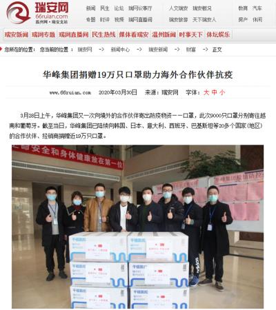3月28日上午,华峰集团又一次向境外的合作伙伴寄出防疫物资——口罩,此次9000只口罩分别寄往越南和葡萄牙。截至当日,华峰集团已陆续向韩国、日本、意大利、西班牙、巴基斯坦等20多个国家(地区)的合作伙伴、经销商捐赠近19万只口罩。