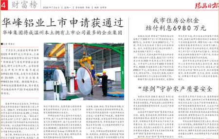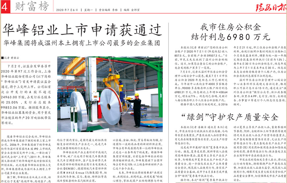随着华峰铝业过会成功,华峰铝业将成为华峰集团旗下拥有的第三家上市公司。2006年,华峰集团旗下的华峰氨纶作为温州首家国内A股IPO上市的民营企业登陆深交所中小板,一举打破了温州民企的“上市荒”;2011年,华峰集团又推动旗下的华峰超纤成功登陆深交所创业板。此次随着华峰铝业登陆上交所,华峰集团将成为温州本土拥有上市公司最多的企业集团。