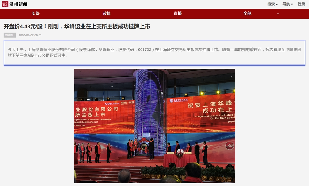 今天上午,上海华峰铝业股份有限公司(股票简称:华峰铝业,股票代码:601702)在上海证券交易所主板成功挂牌上市。随着一串响亮的敲锣声,标志着温企华峰集团旗下第三家A股上市公司正式诞生。