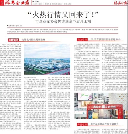 “年后,公司生产已步上正轨,各项工作井然有序。”日前,华峰集团副总裁尤飞锋表示,2022年集团实现营收近700亿元,2023年将遵照稳进提质、低碳转型、创新增效的工作主线,加大关键核心技术攻关,补齐创新增效短板,加速产业低碳转型,夯实绿色发展的底板,加强智慧园区和数字化工厂建设,打造智能制造模板,与上下游企业一起做大行业“蛋糕”,巩固并做强产业链,努力为幸福瑞安贡献力量。