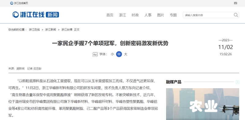 “以前鞋底原料是从石油化工里提取,现在可以从玉米里提取加工而成,不仅透气还更环保、可再生。”11月1日,浙江华峰新材料有限公司的研发车间里,技术人员蔡万东向记者介绍“高生物基含量环保型中底用聚氨酯原液”刚刚获得了新的发明专利。不断向新技术突破,位于瑞安的华峰集团有限公司旗下4家企业3个产品获得国家级制造业单项冠军,“华峰新材料”便是该集团旗下公司之一。
